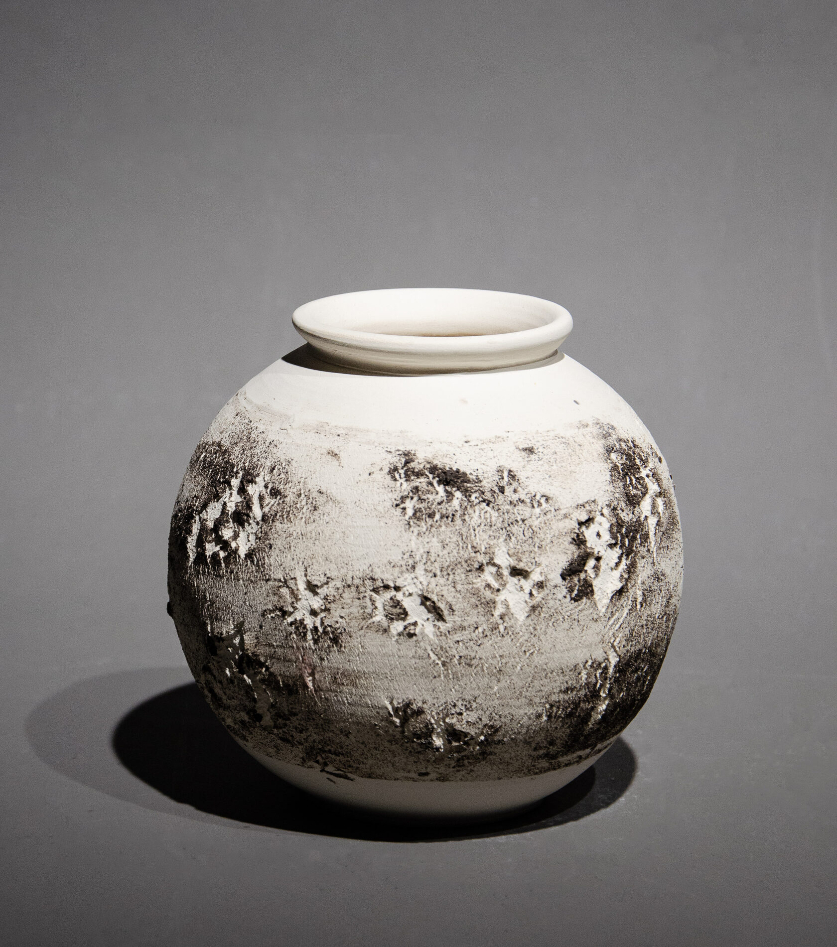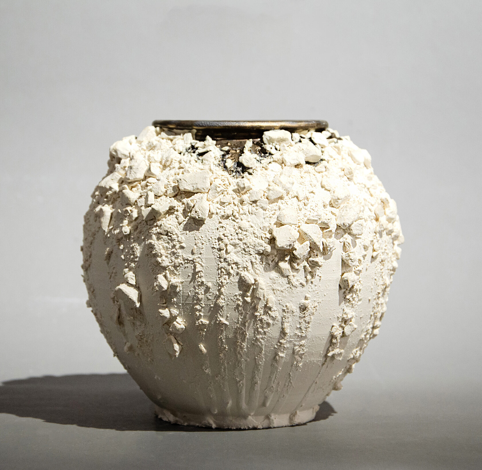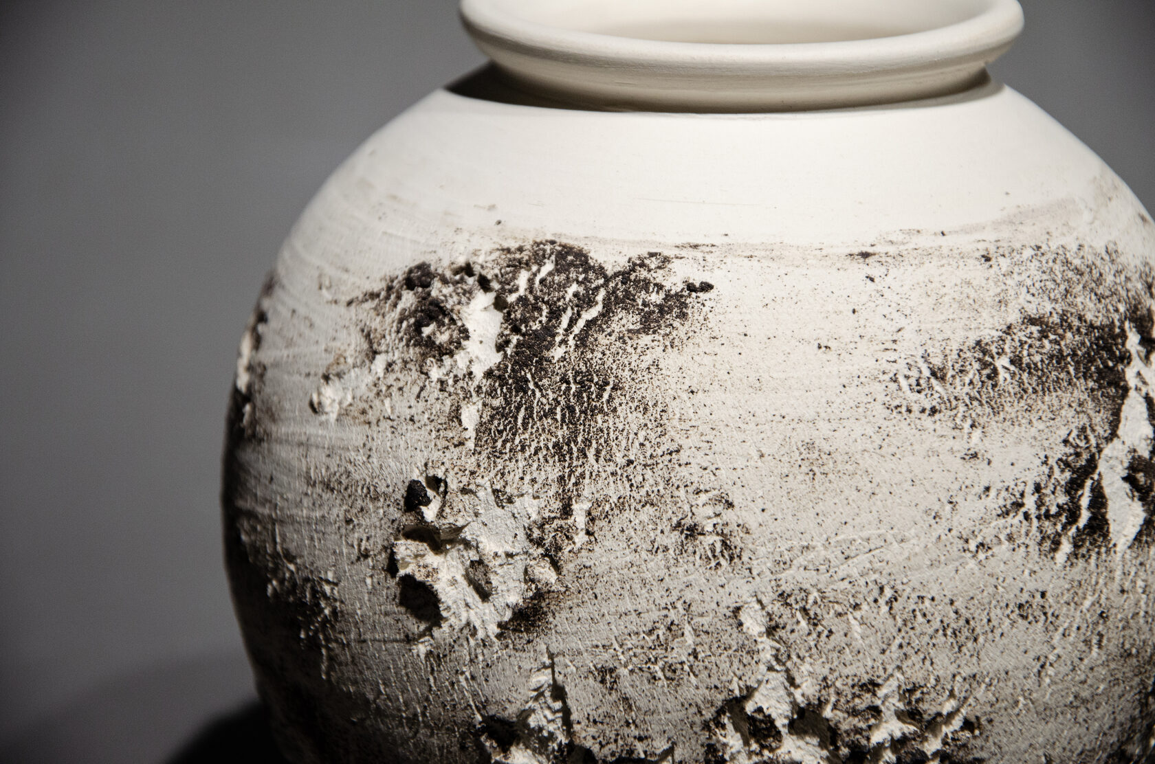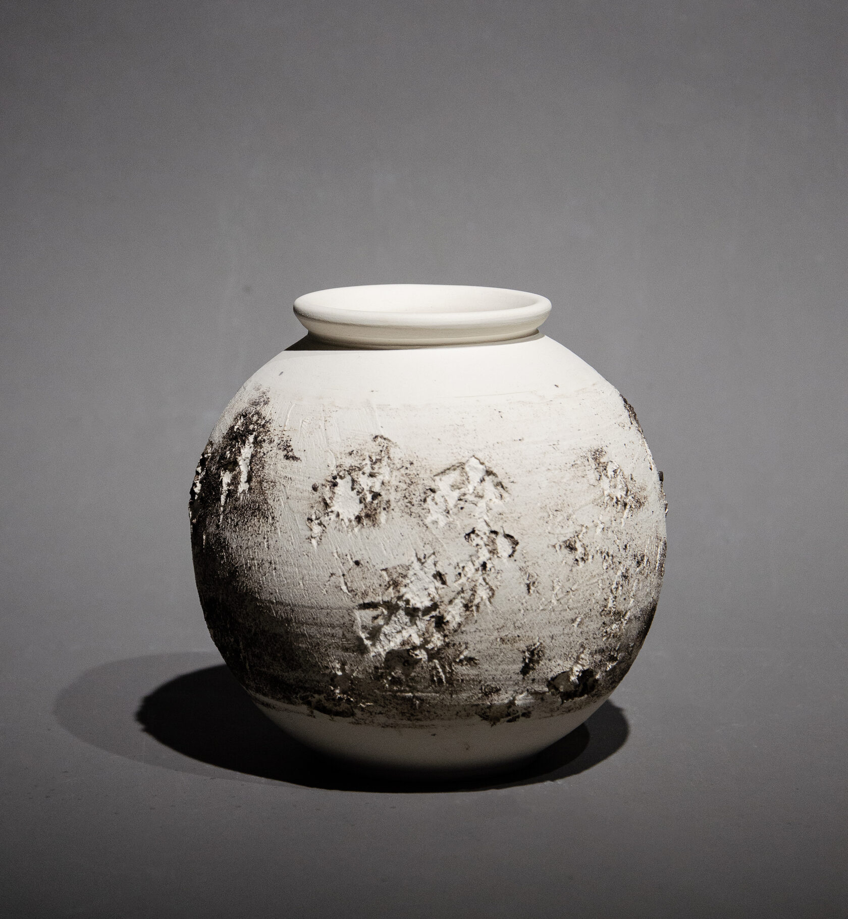 Эта ваза напоминает фрагмент древнего утёса, обветренного временем и ветром. Её матовая, почти молочная поверхность - как свет, отражённый с холодной вершины, где воздух становится тонким и тихим. Тёмные шероховатые вкрапления рождают ощущение природной силы: будто это следы ветра, соли и времени, оставленные на камне после долгого воздействия стихии.