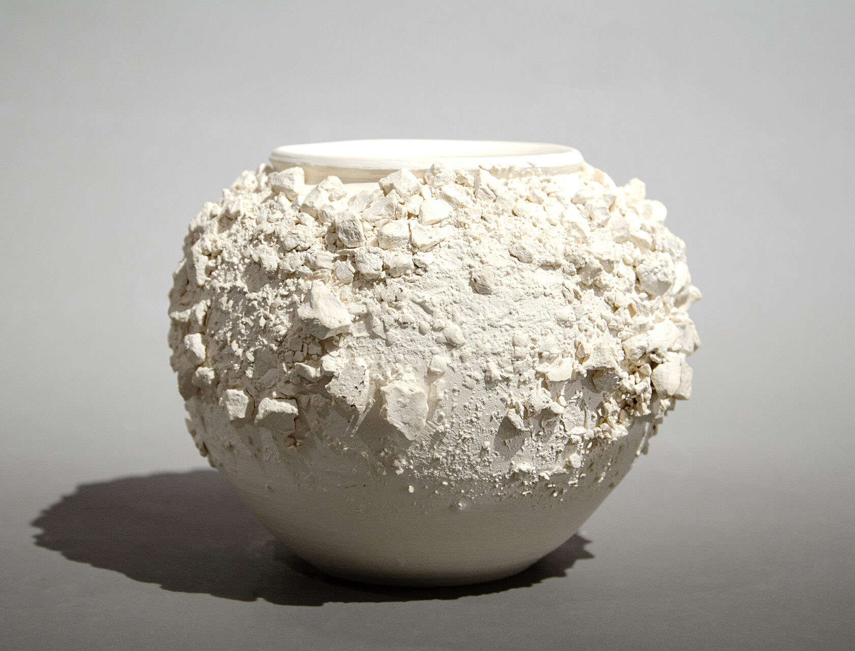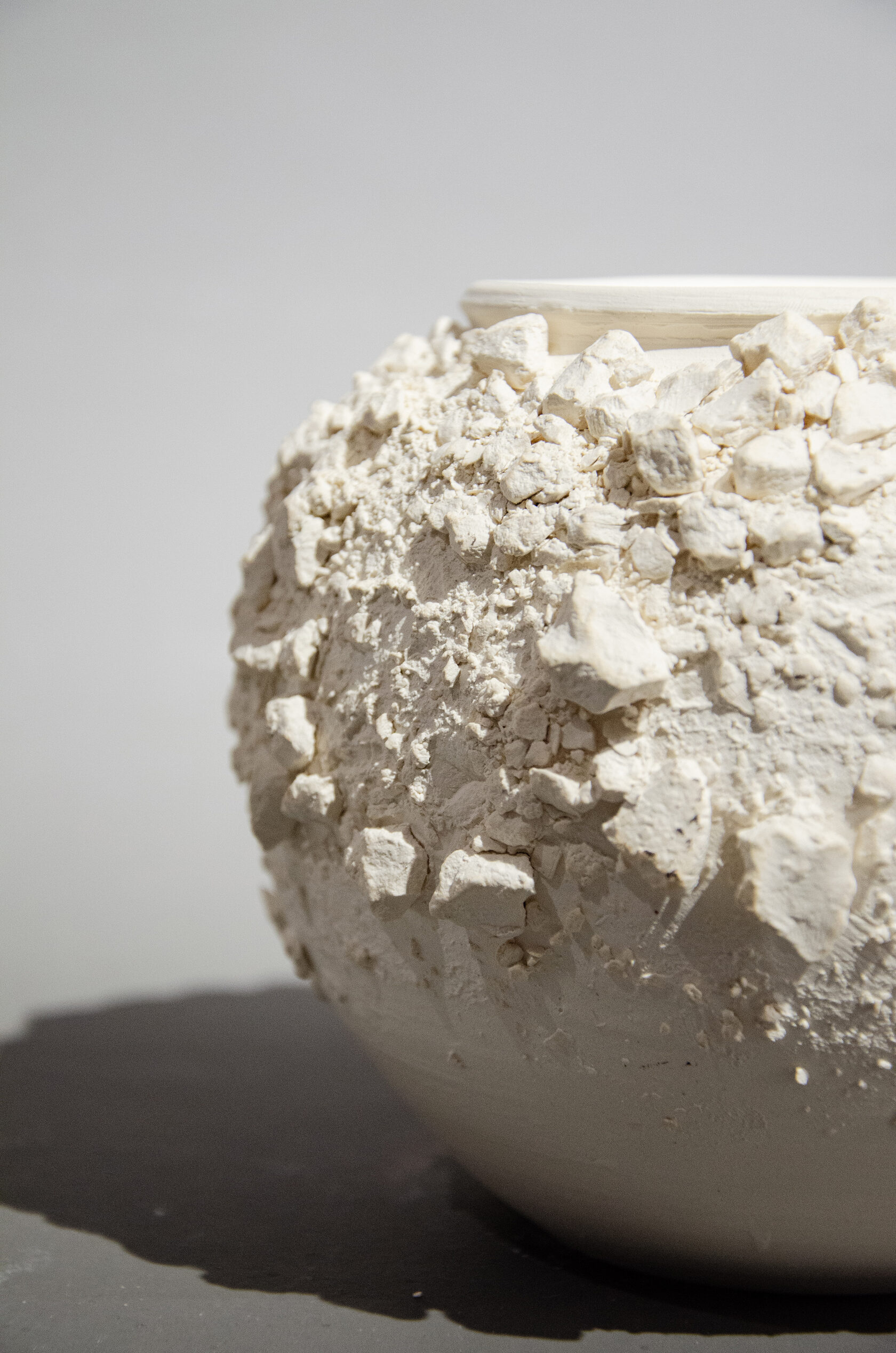 Поверхность вазы покрыта матовой белизной и нежной крошкой. Словно снег только что лёг на землю, ещё не успев утрамбоваться. Она мягкая и одновременно острая, как зимний холод.