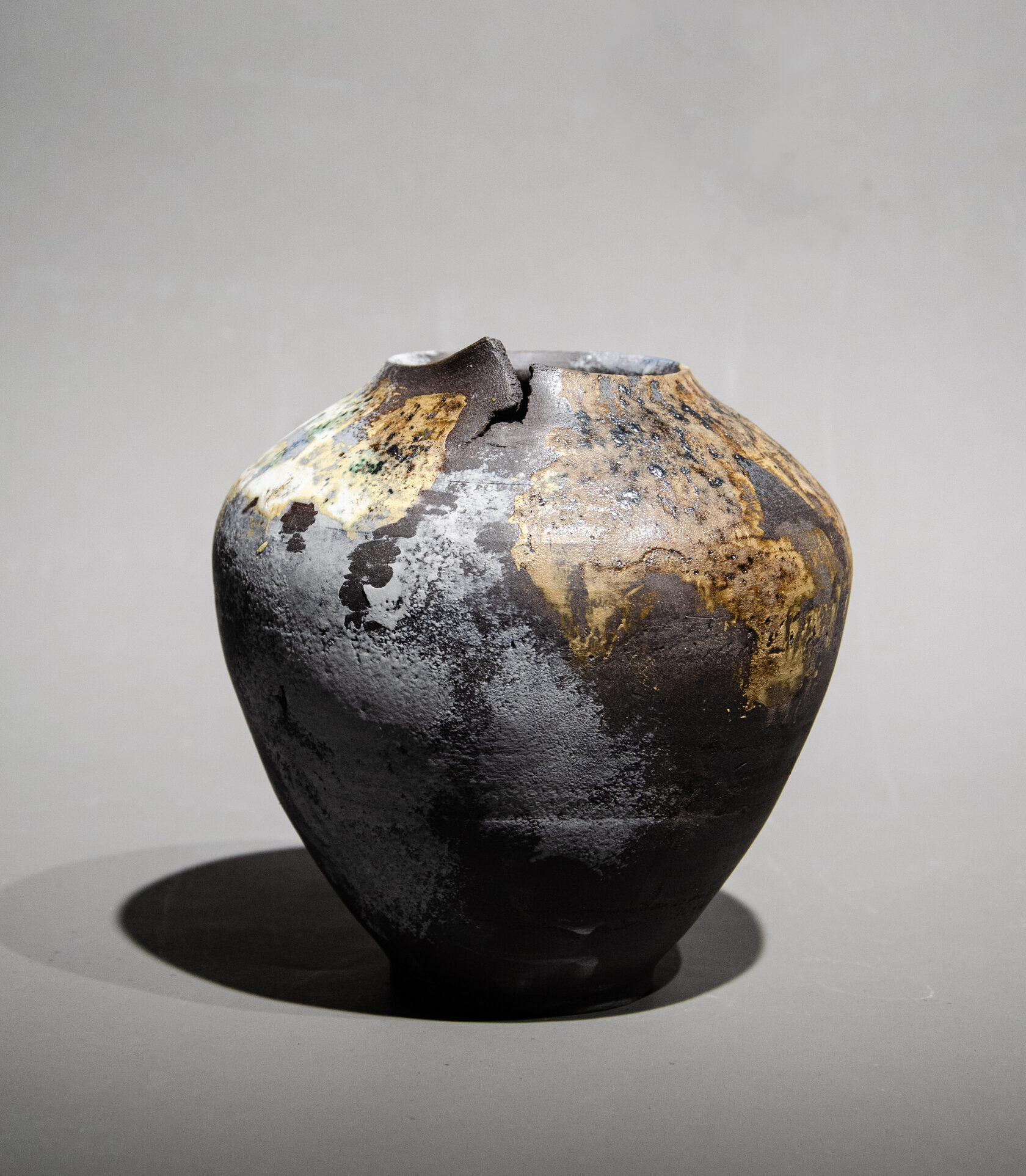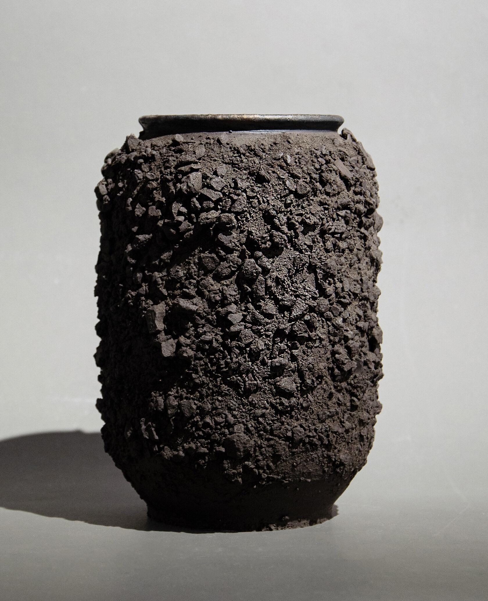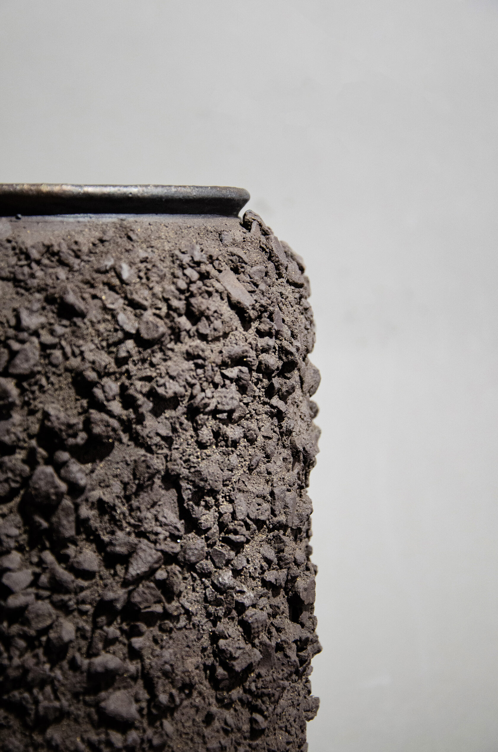 Грубая, тёмная, монументальная — ваза как фрагмент доисторической геологии. Ее поверхность будто прожжена лавой и временем Для пространств, где важна сила материала и атмосфера архаики