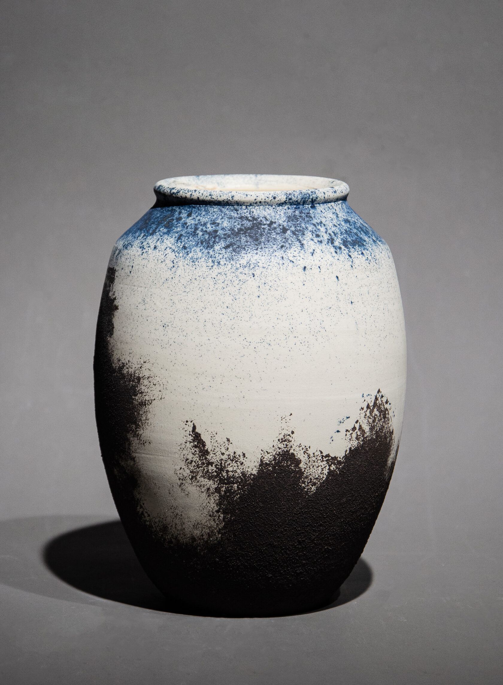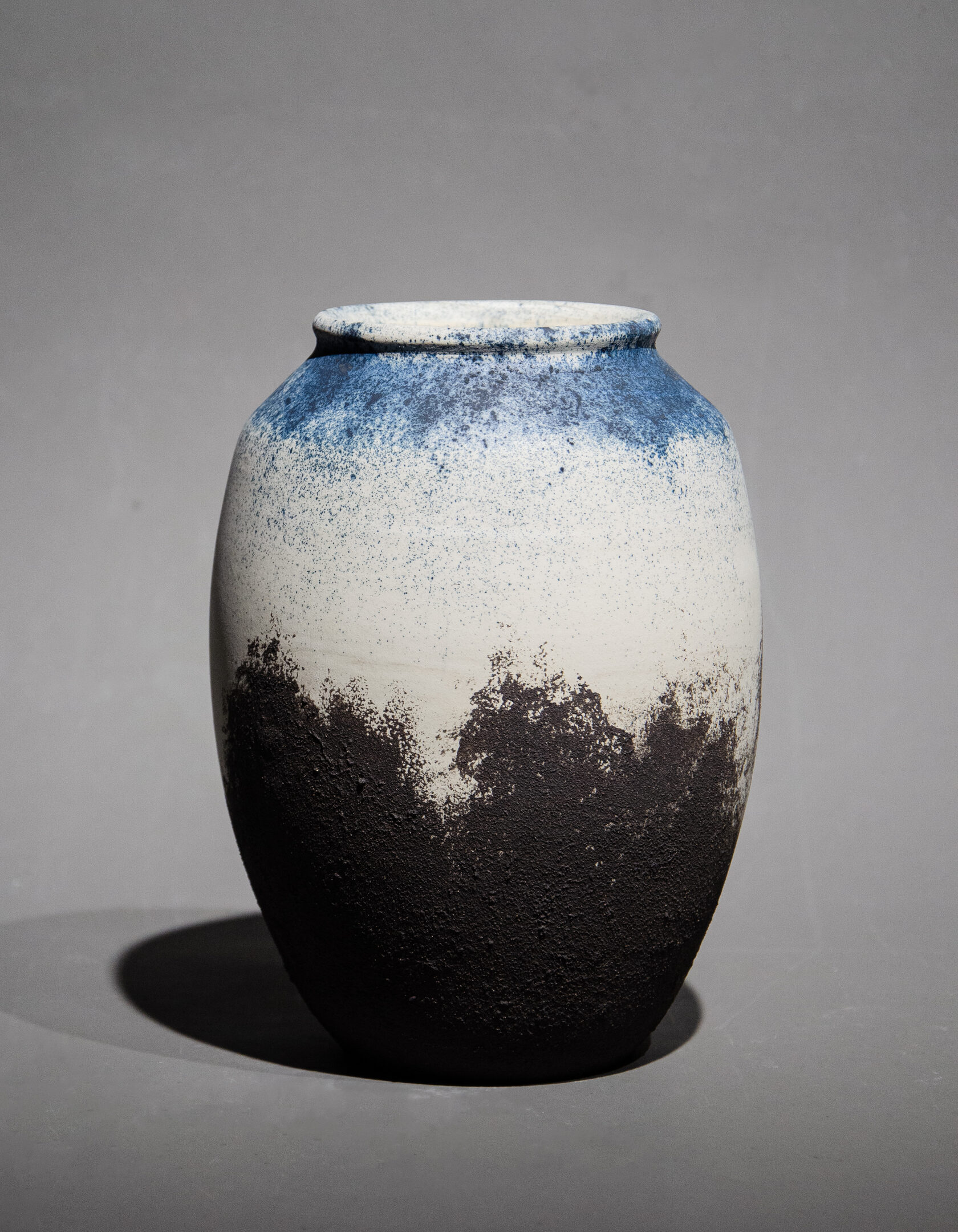 Фактура глины встречается с глубоким пигментом синего — переход от плотной земли к холодному воздуху. Поверхность — словно почва, напитанная дождём, где свет и тень рождают движение