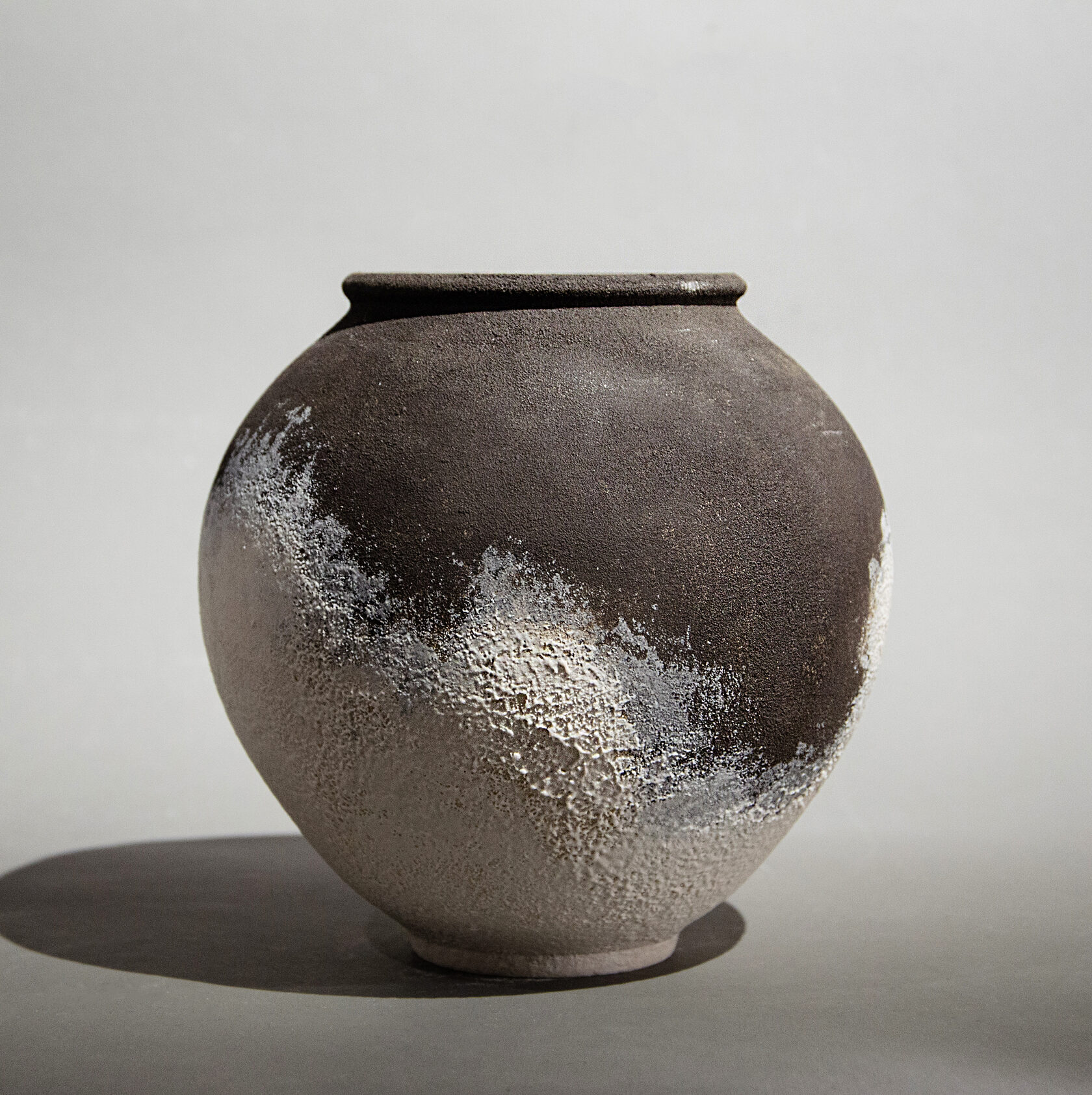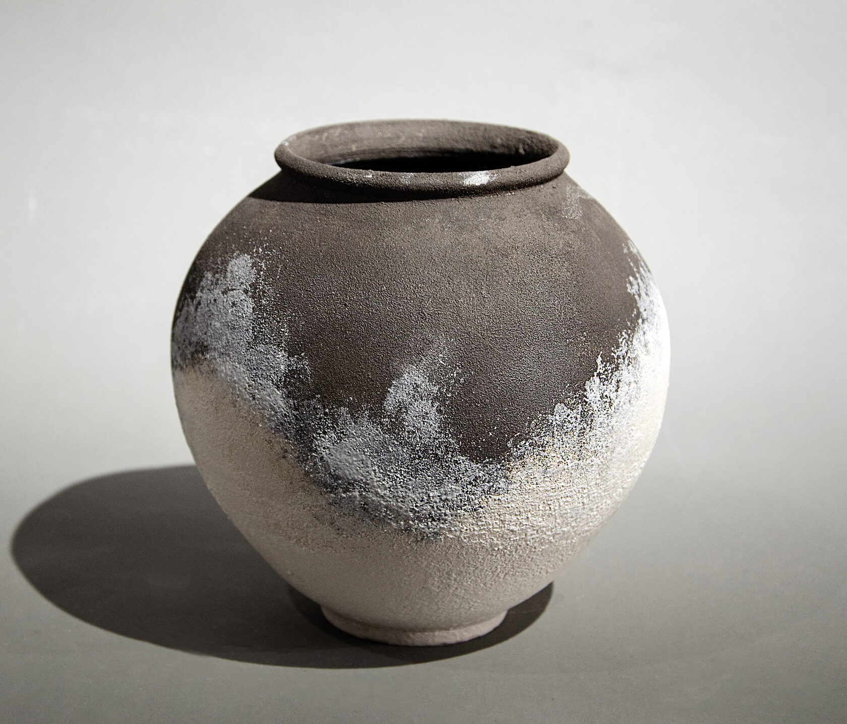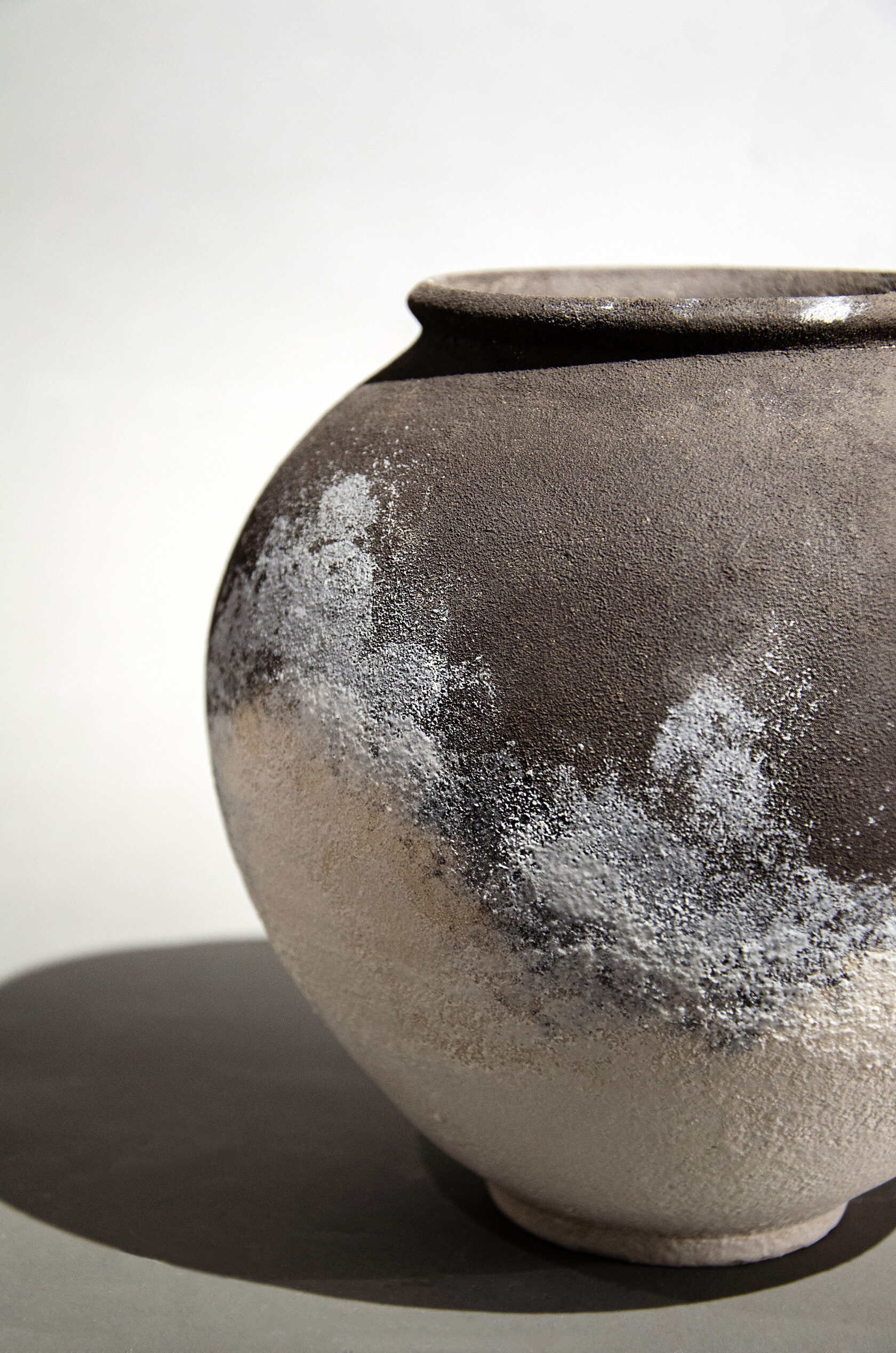 Эта ваза - про момент, когда ранняя дымка ещё не рассеялась и медленно стелется над тёплой землёй. Её поверхность напоминает дыхание природы: тёмные, глубокие слои - как влажная почва, хранящая тепло ночи, а светлые, шероховатые участки похожи на туман, что мягко спускается к земле, сливаясь с ней в единый контур.