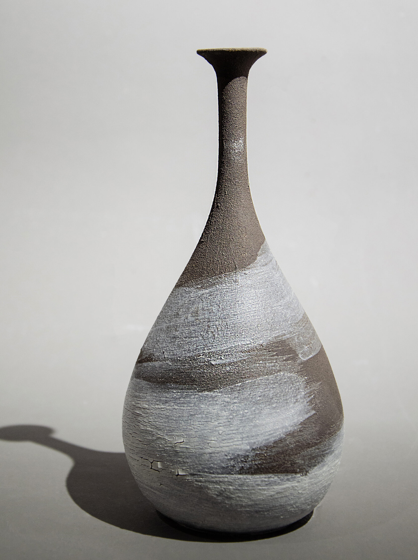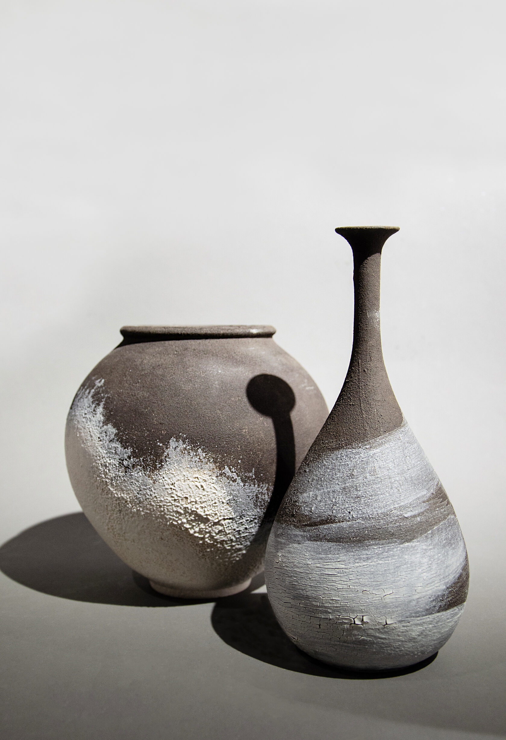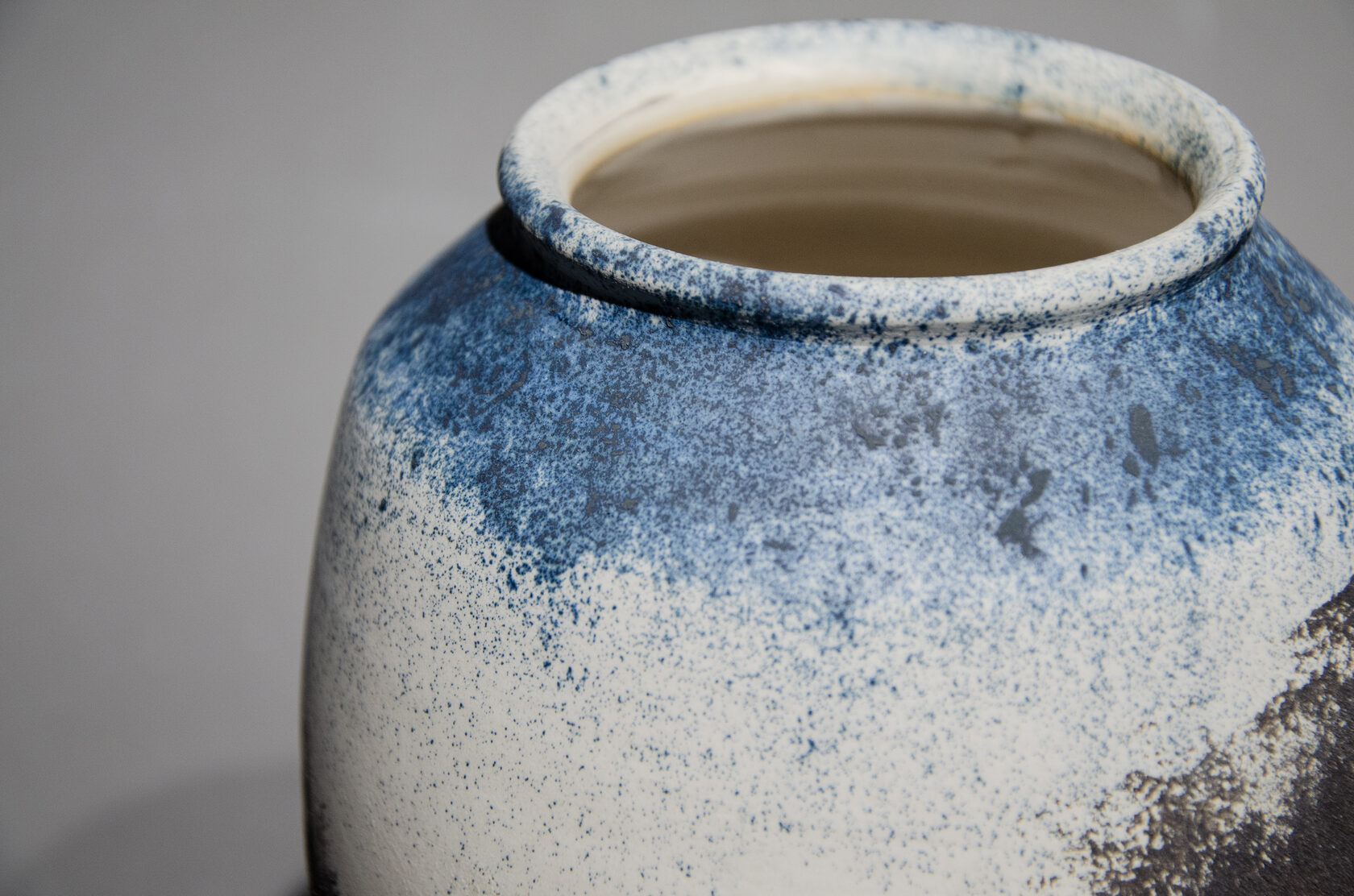 «Тень ветра» - керамическая ваза с выразительной, словно вытянутой в небо формой, где тонкая шейка мягко перетекает в объемное тело. Поверхность напоминает следы стихии: светлые потёрто-дымчатые мазки скользят по темной глине, будто ветер оставил на ней свои линии движения. Матовая фактура, едва шероховатая, создаёт ощущение природности и тихой силы.