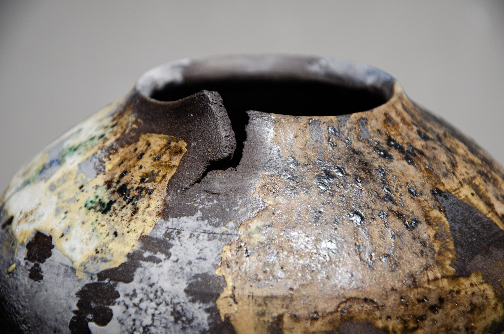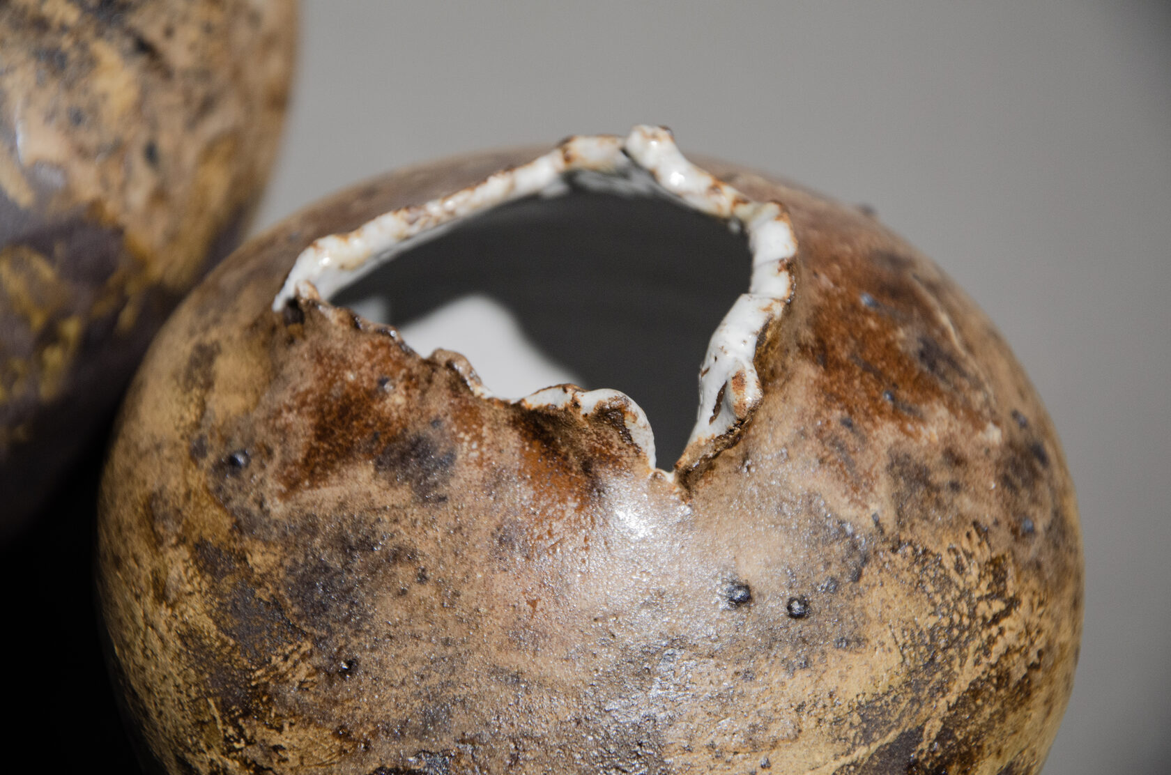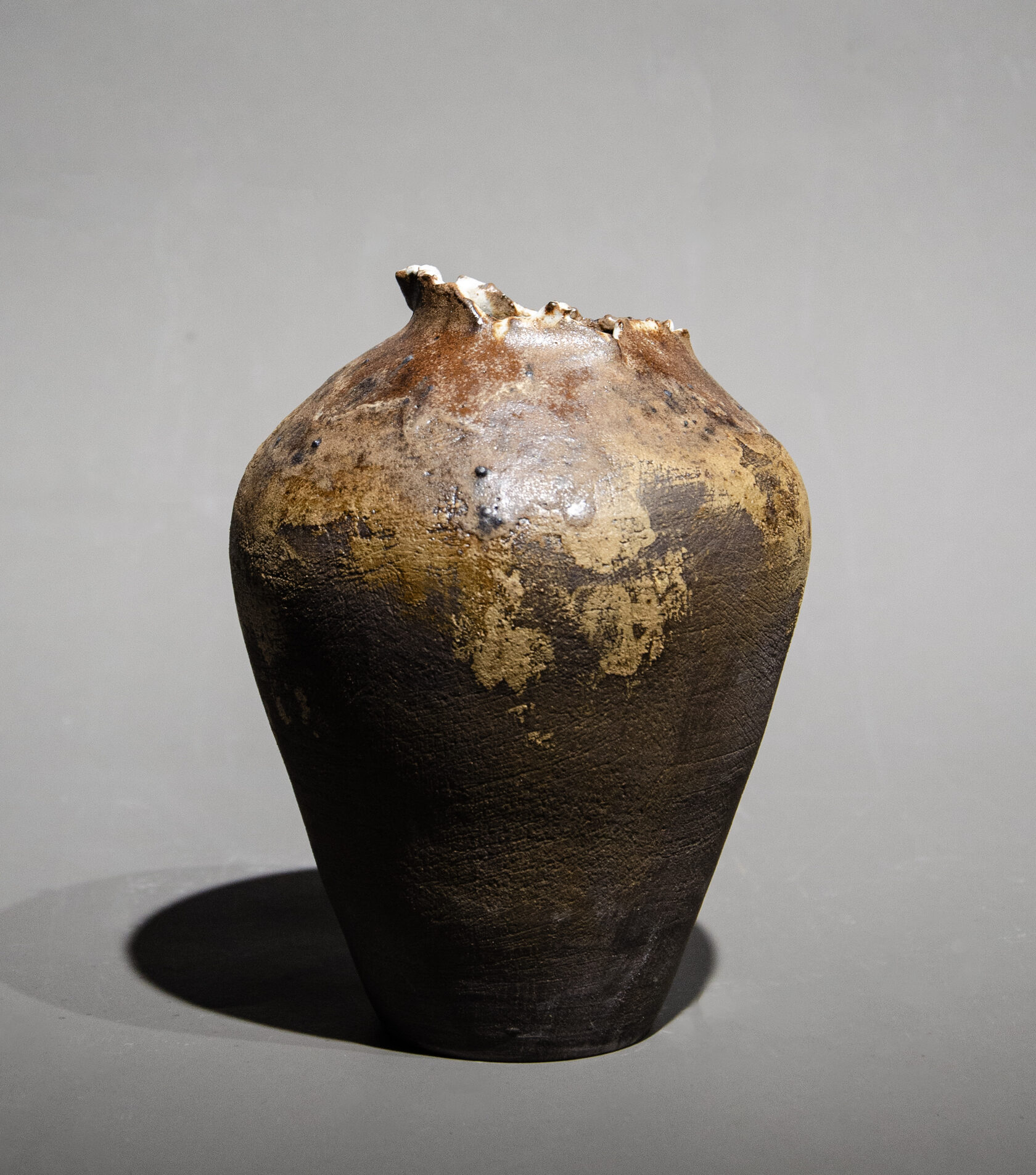 «Дыхание вулкана» - ваза, в которой застывшая глина превращается в историю огня. Её силуэт массивный, собранный, словно сформированный давлением земных пластов. Поверхность - тёмная, с грубой фактурой, прожжённая теплом: пятна охры и обугленные переходы напоминают следы лавы, остывшей на ветру. Края горлышка будто расплавлены и застыли в момент вспышки - неровные, живые, сохраняющие энергию первородного жара.
