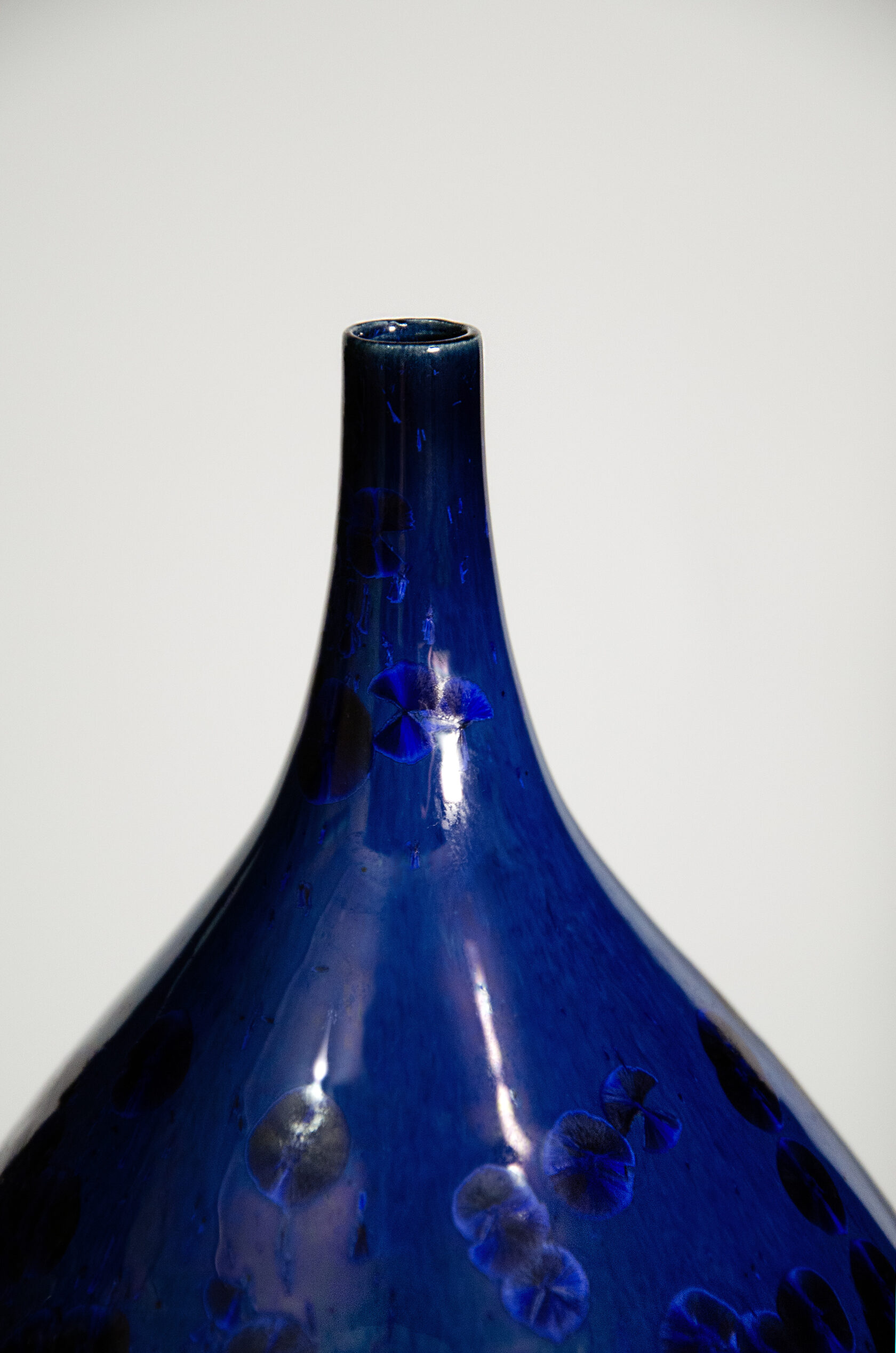 Симметрия формы и кристаллический обжиг вступают в тонкий диалог: строгая линия сталкивается с текучестью глазури, оставляя следы
